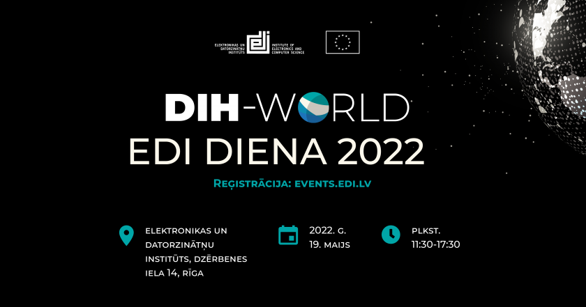 2022.gada 19. maijā no plkst. 11:30 līdz 17:30 ielūdzam Jūs uz klātienes DIH-World “EDI Diena 2022” pasākumu, lai iepazīstinātu ar DIH-world projektu, jaunākajiem EDI zinātniskajiem projektiem un tehnoloģijām, un to, kā uzņēmumi var iegūt līdz pat 90k EUR finansējumu industriālo procesu digitalizācijai, un daudz ko citu.