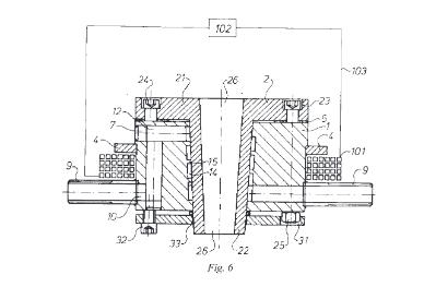 5. Bronzas nepārtrauktās liešanas elektromagnētiskais kristalizators saskaņā ar 1. punktu, kas atšķirīgs ar to, ka konusveida ieliktnī (2) ir izveidota centrālā konusveida atvere (26), bet cilindriskajā izejā (21) ir izveidotas daudzas atveres (23).