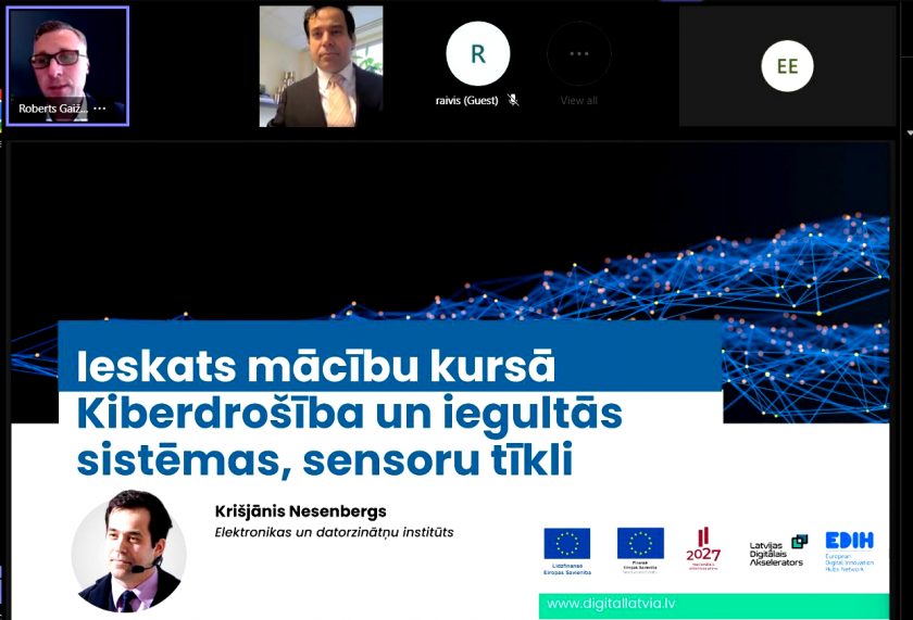 Krišjānis Nesenbergs pastāstīja par EDI apmācību tēmu: „Kiberdrošība un sensoru tīkli” tas ir , ar kādām problēmām būs jasaskarās, kāpēc tādas specifiskas apmācibas ir vajadzīgas un ko apmācību dalībnieki uzzinās. Prezentācijā tika iekļauta gan programmatūras, gan iekārtu, gan vadības bloku, gan mikročipu apskats sakarā ar kiberdrošību.