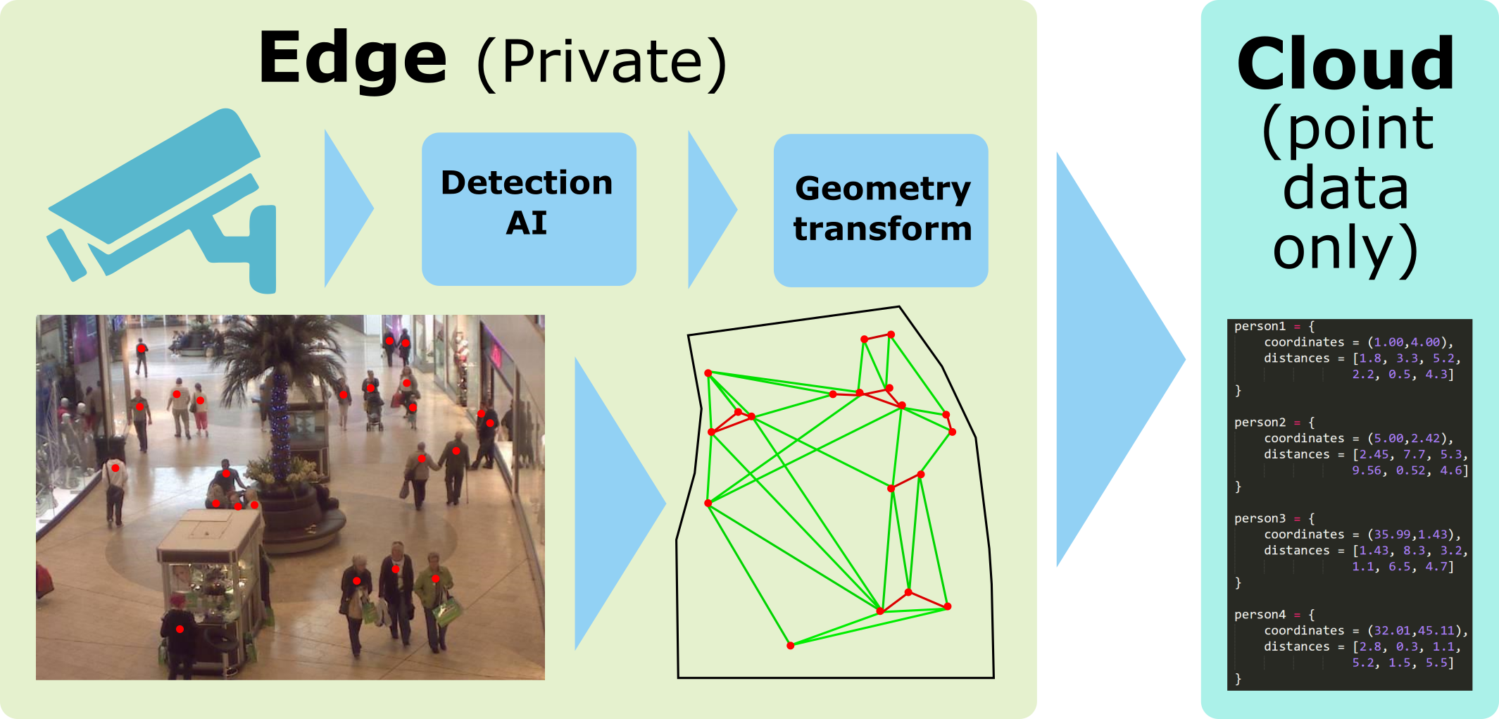 Izveidot malas (edge) sistēmas prototipu kas limitētos resursos saglabājot cilvēku privātumu var video noteikt cilvēku atrašanās vietu un pētniekiem nodrošināt uzticamu informāciju par attālumu starp cilvēkiem telpās laika griezumā.